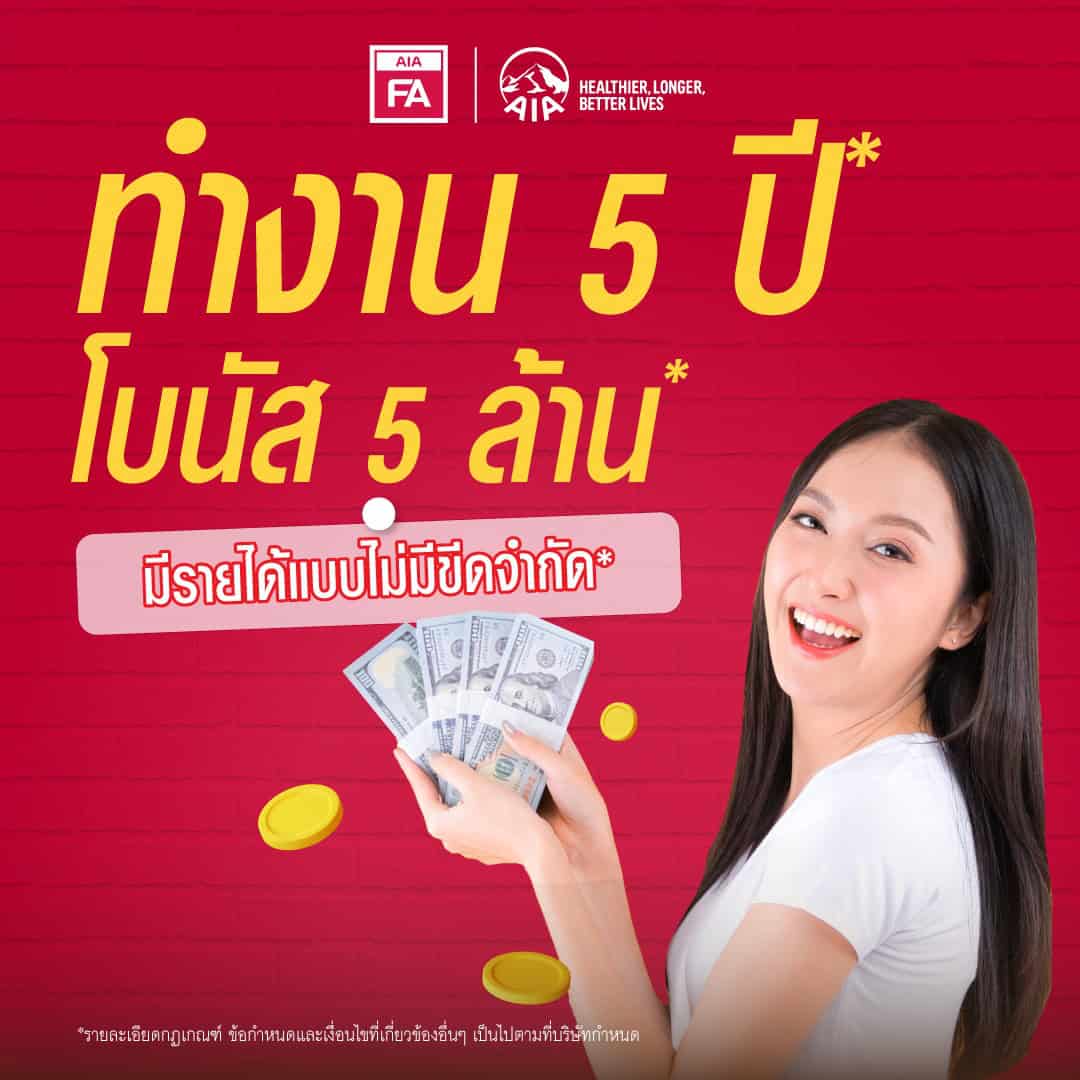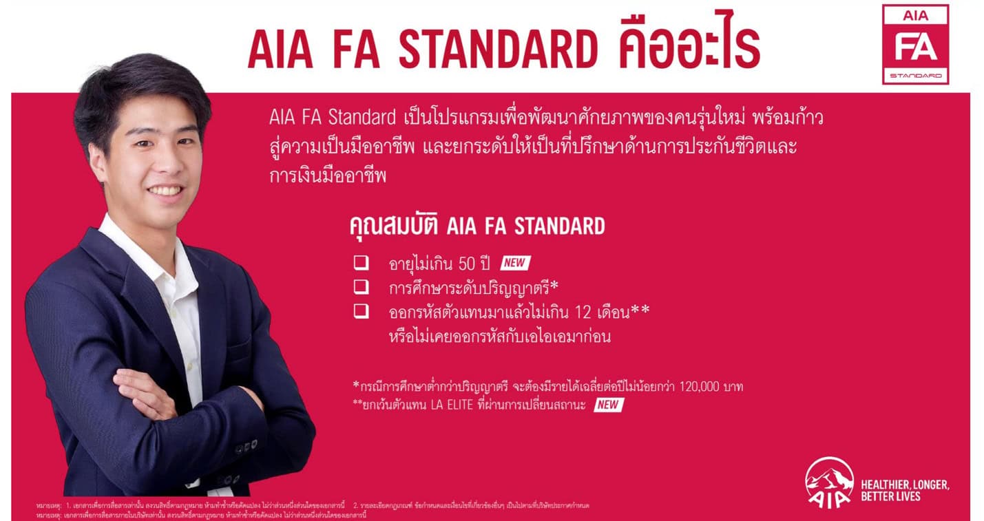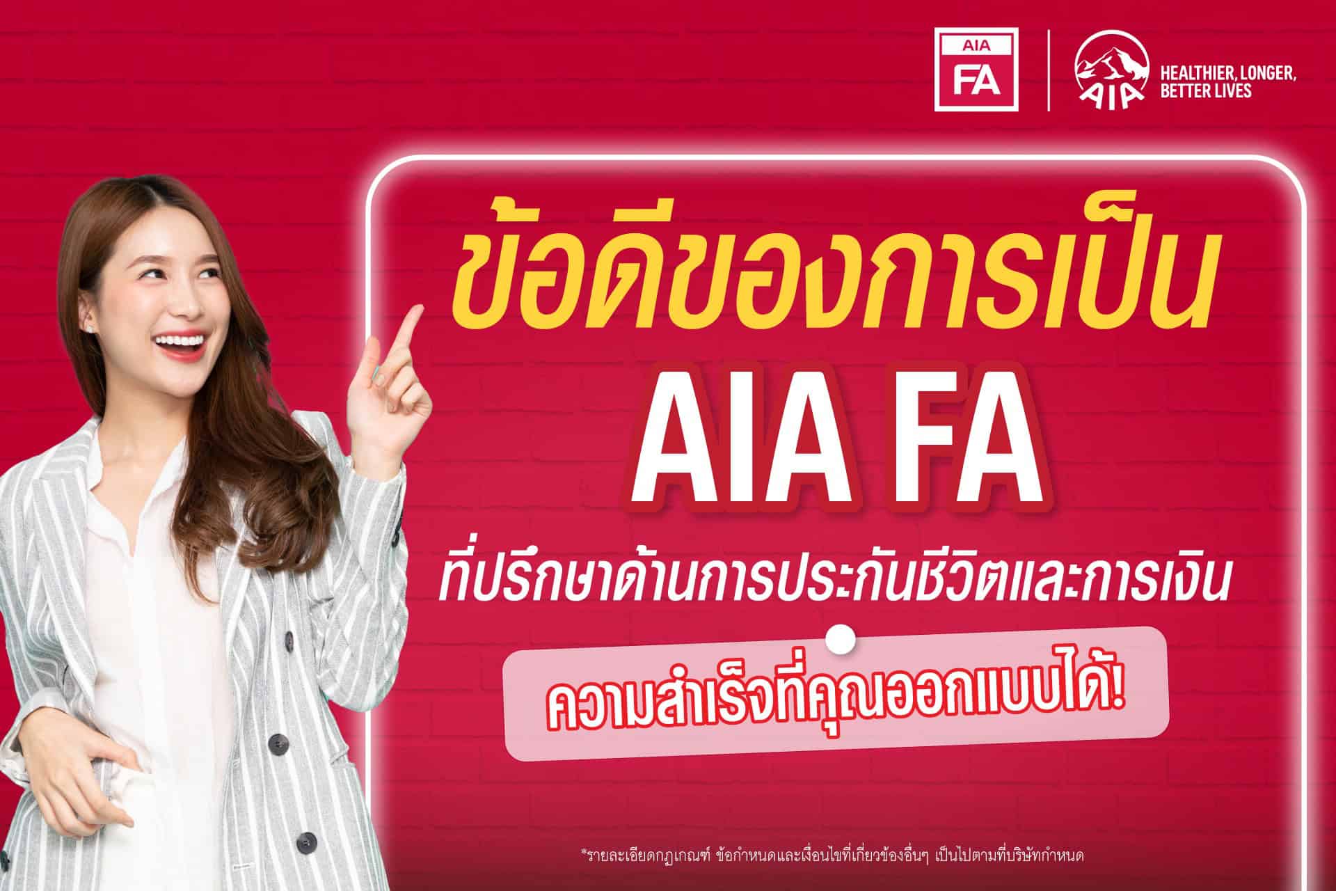 หากคุณต้องการความมั่นคงในอาชีพ รายได้ และออกจากรูปแบบการทำงานแบบเดิม ๆ นี่คือโอกาสดีที่คุณจะได้ออกแบบชีวิต และการทำงานในแบบที่คุณต้องการไปกับเรา ร่วมเป็นที่ปรึกษาด้านประกันชีวิต การเงิน และสุขภาพกับ AIA ไปกับโครงการ AIA FA เพื่อความก้าวหน้าและชีวิตที่มั่นคงของคุณเอง